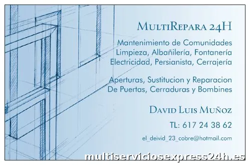 Albañil Servicio de antenas Instalación de persianas Electricista Carpintería Empresa de aislamientos Cerrajero Pintor Empresa de escayolas FontaneroHorario de apertura: